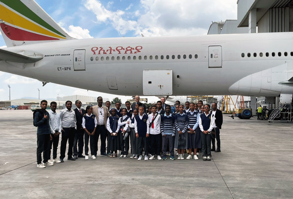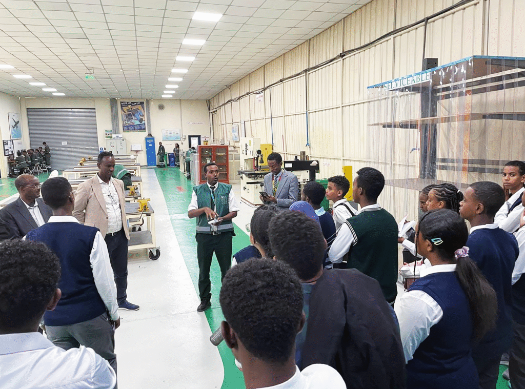 The students gained a unique learning experience through visits to the Ethiopian Airlines Maintenance Facility (MRO), Sky Technologies, and Aviation Academy. These tours provided an opportunity to observe the practical aspects of engineering and aviation maintenance, offering them a clearer understanding of aircraft operations.